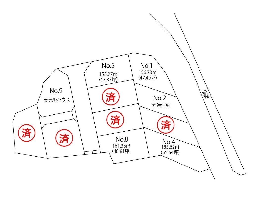 全11区画の造成団地のうち、現在販売中の4区画はすべて平地。
