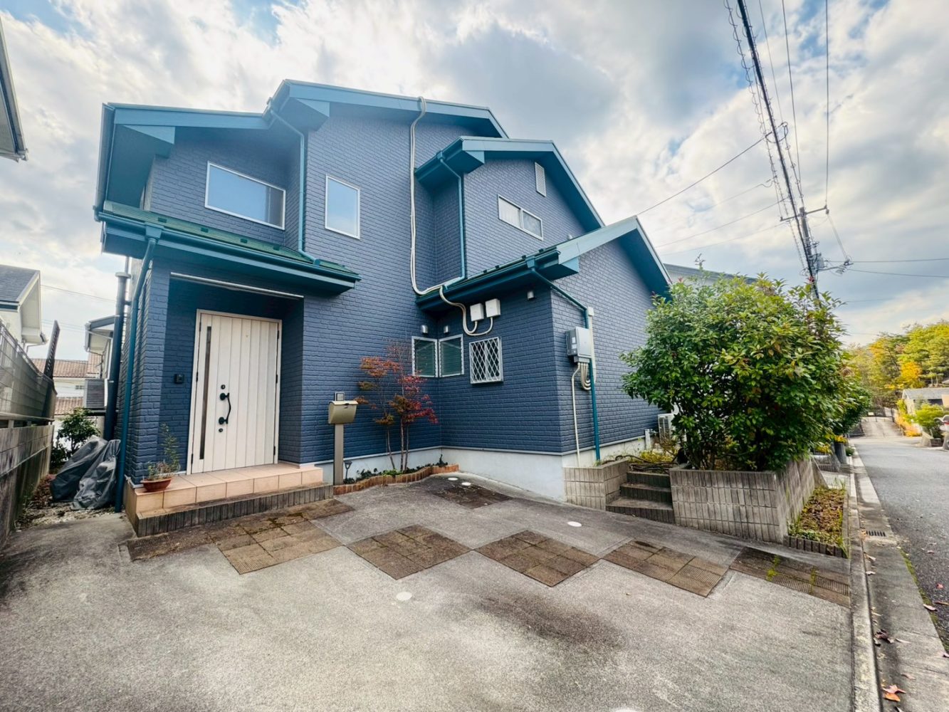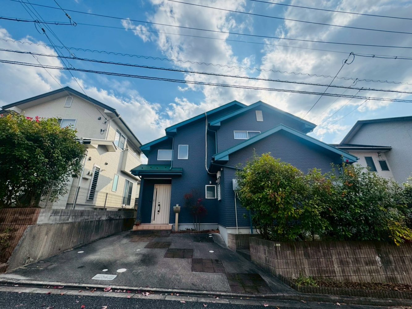 ここは、坂の上の住宅街で「公園を自分たちの庭みたいに使う」ための4LDK。ネイビー外壁×グリーン屋根のちょっと個性的な外観に、オール電化+太陽光7.32kW。車移動が前提だからこそ、夜はしんと静かで、空がよく見える。