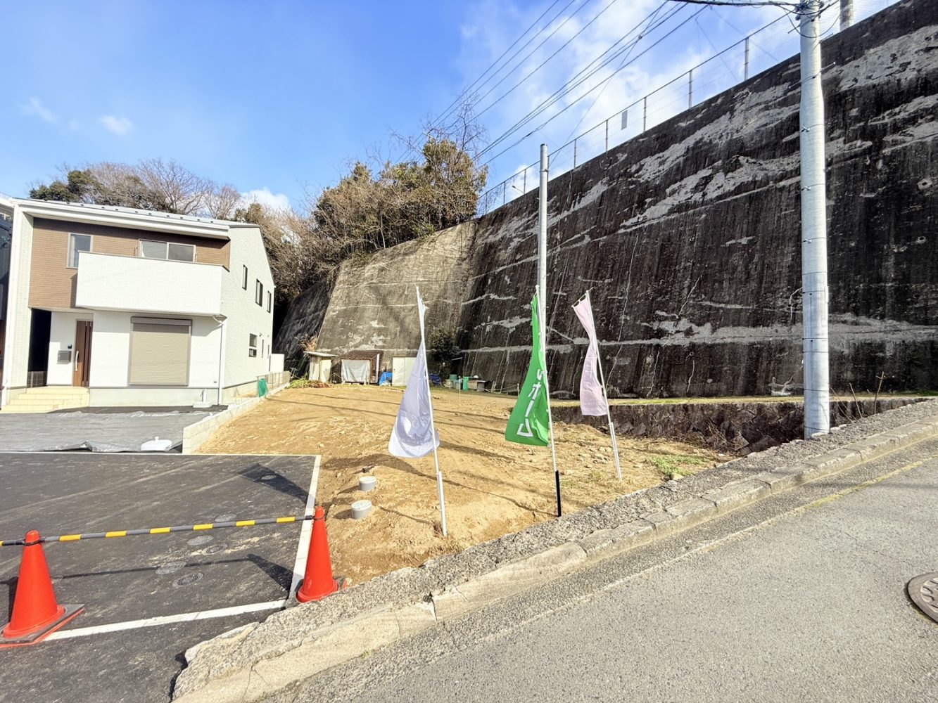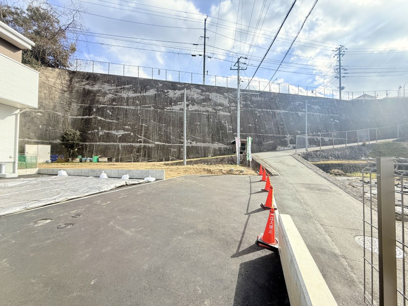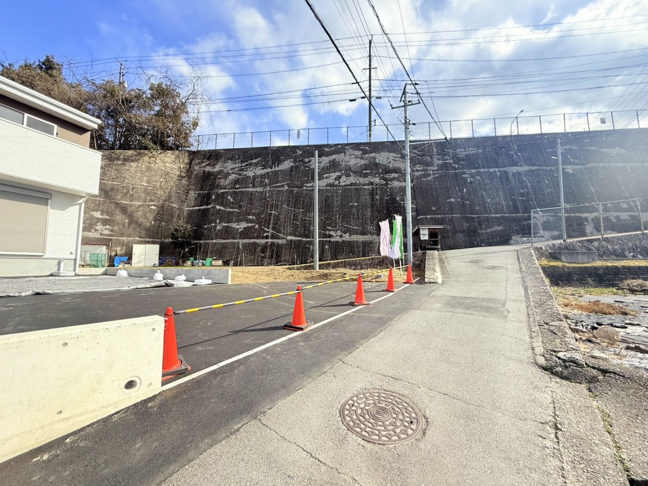 前面道路は幅にゆとりがあり、車は2台並べて駐車可能。